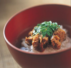 天然鯛の身を赤味噌で煮含めたお茶漬けです。